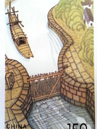 Stamp 3 shows an early Lingqu 灵渠 Magic Transport Canal lock, a type of flash lock with a temporary blockade of the canal using timber braces [ placed in masonry slots ] with reed or bamboo mats. When the diagonal timber was released, the blockade collapsed, and the surge of water carried the barge riding through and on downstream.